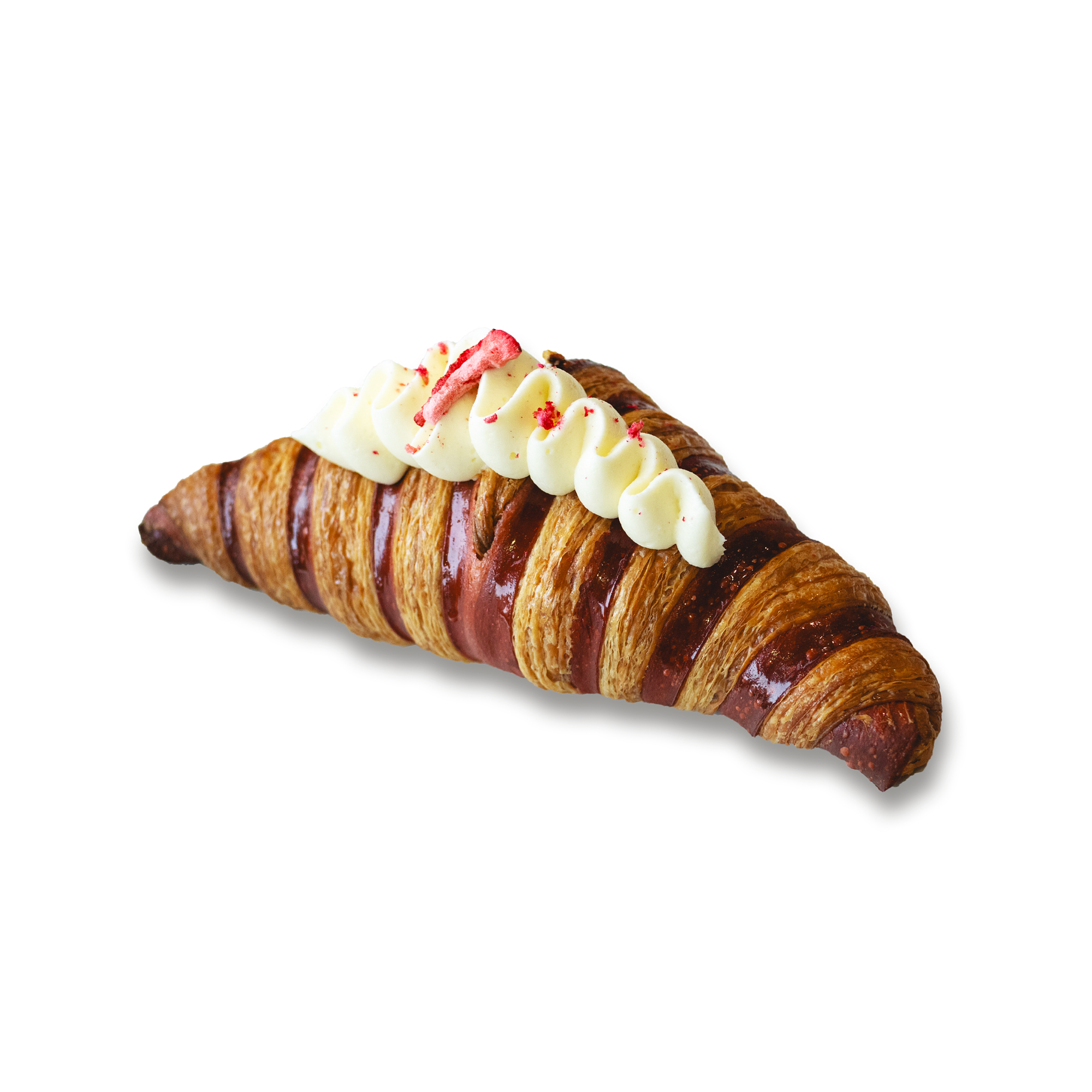 Buttery, flaky layers surround a light, creamy blend of raspberry jam and whipped cream cheese mascarpone in this strawberry crème deluxe croissant, finished with freeze-dried strawberries. Perfect for slow mornings, shared moments, and savoring over coffee.