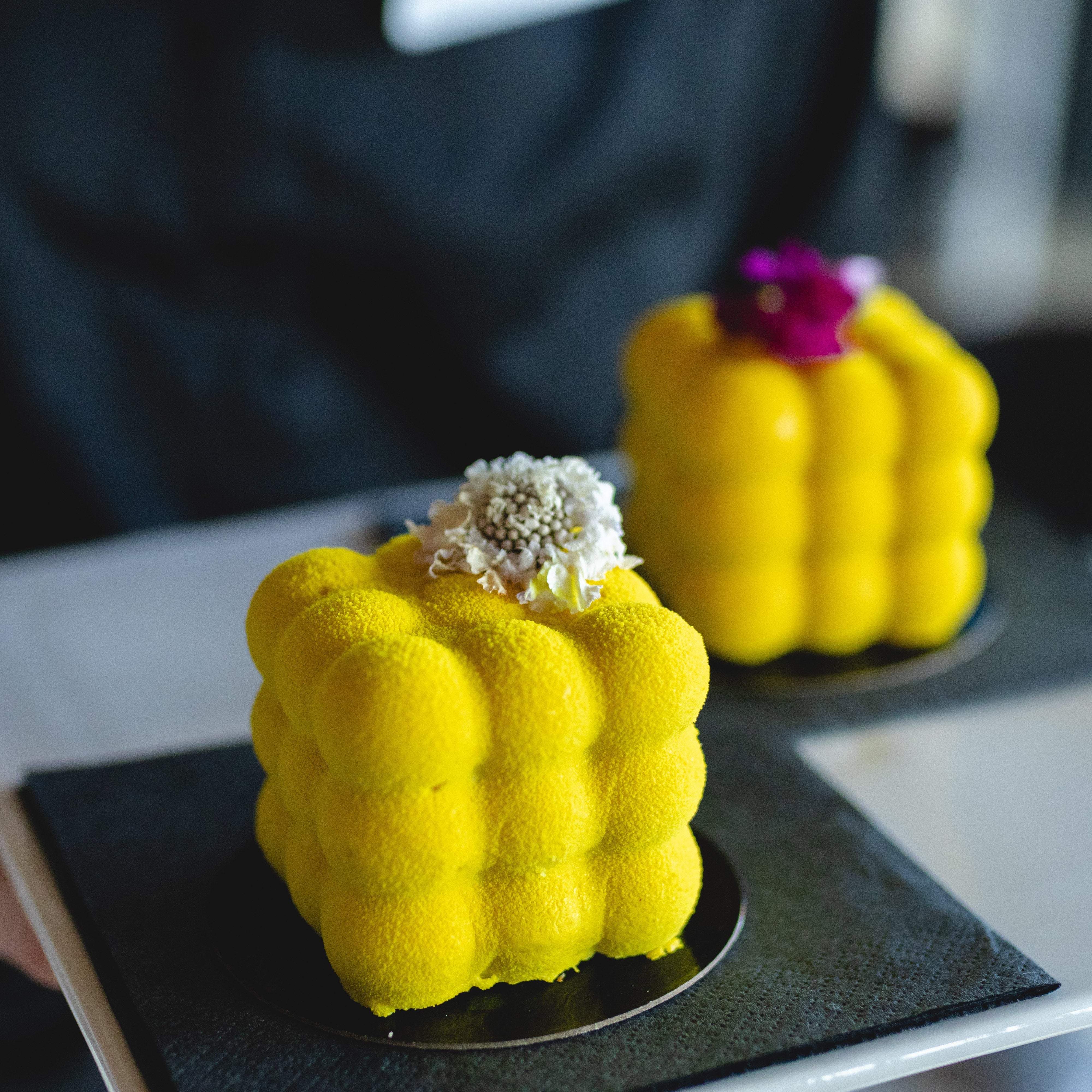 A glossy chocolate shell encasing light strawberry mousse with a vibrant lemon curd center and almond cake base. Finished with an edible flower for an elegant, spring-forward dessert.